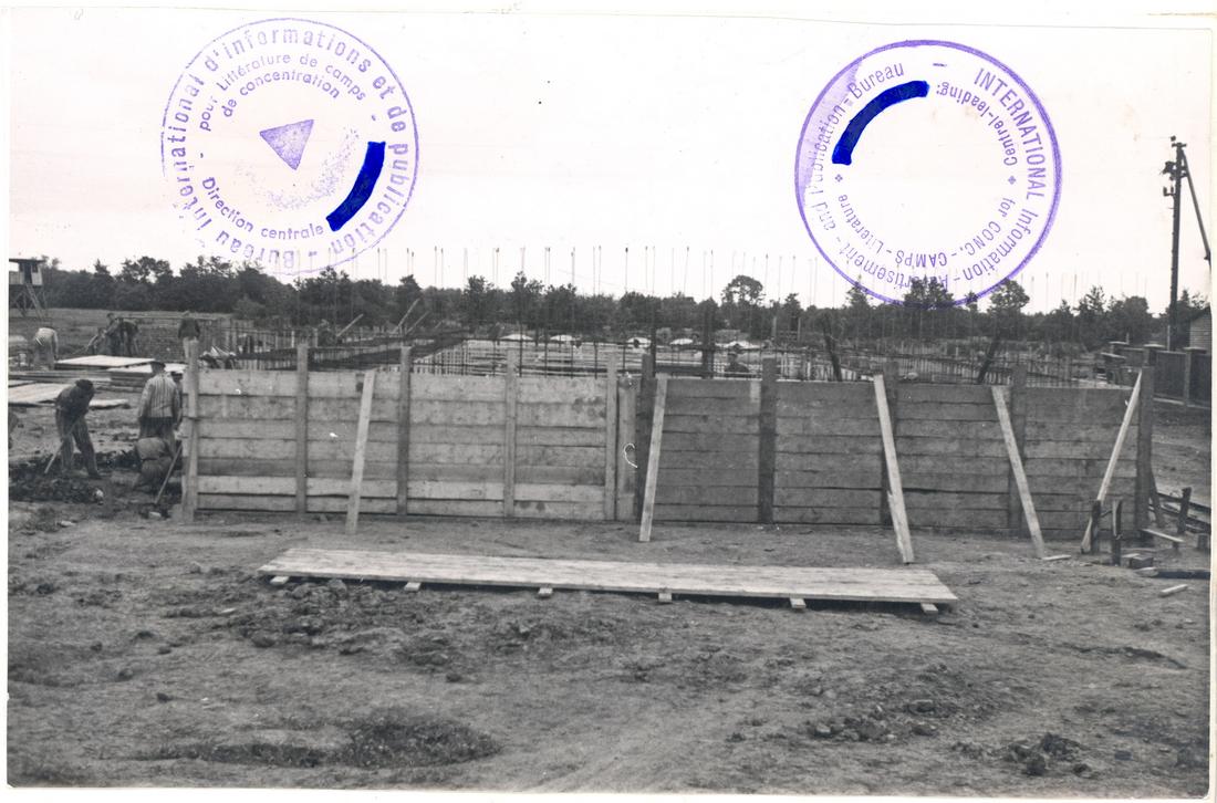 Einschalungsarbeiten an einem SS-Mannschaftsbunker. Am rechten Bildrand ist der noch nicht versetzte gemauerte Zaun um das SS-Lager zu erkennen. SS-Foto aus dem so genannten Masset-Album, nicht datiert. (ANg)