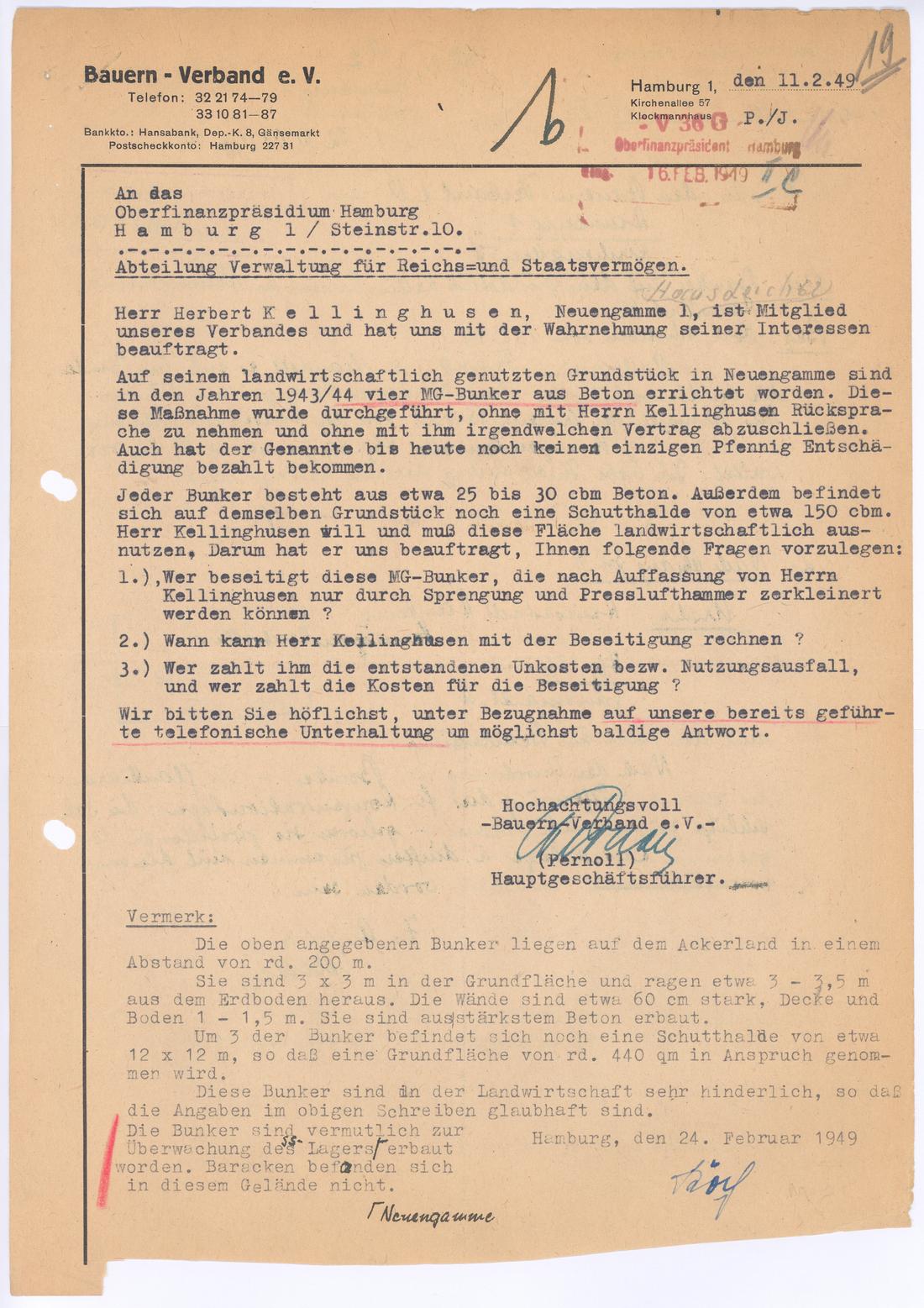Anfrage des Bauernverbandes an das Oberfinanzpräsidium bezüglich des Abrisses der MG Unterstände, 11.2.1949. (JbH)