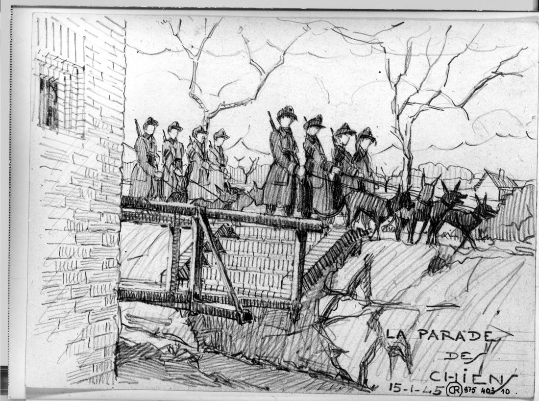 Die SS-Hundestaffel bei einem Patrouillengang auf dem Neuen Heerweg (heute Jean-Dolidier-Weg) am südwestlichen Wachturm. Bleistiftzeichnung des ehemaligen Häftlings des KZ Neuengamme Lazare Bertrand, 15.1.1945. (ANg)