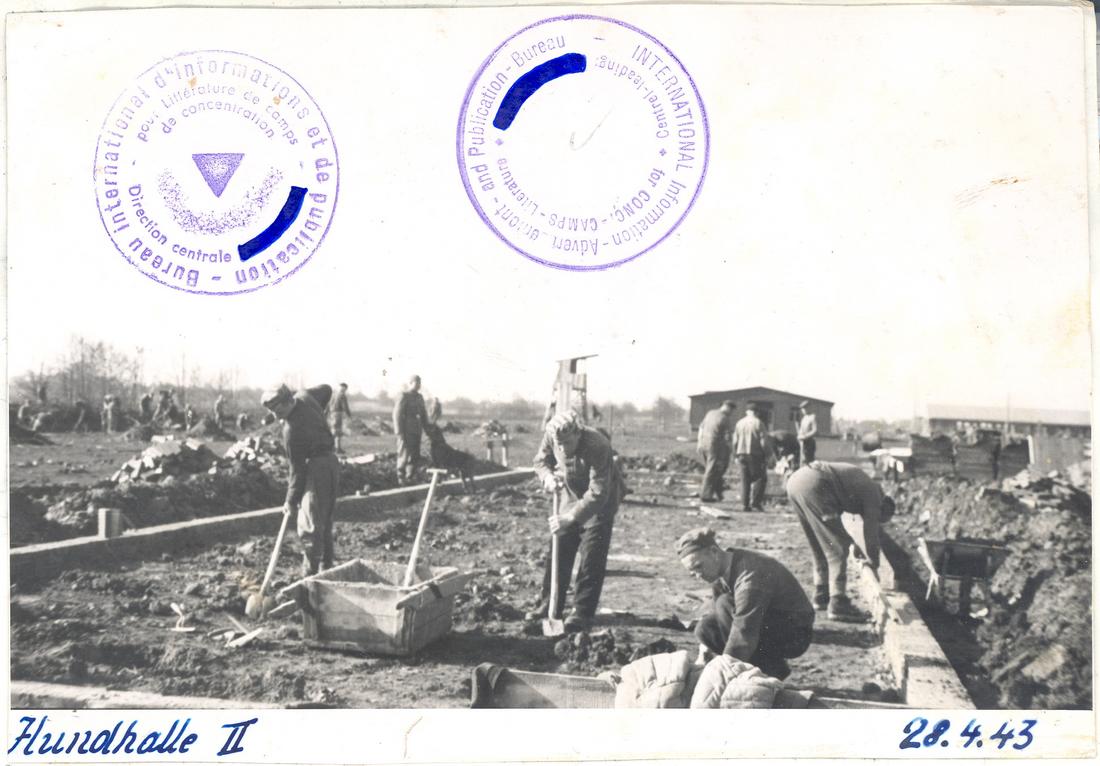 KZ-Häftlinge errichten die Fundamente eines der drei Flügel des Hundezwingers ("Hundehalle II"). SS-Foto aus dem so genannten Masset-Album, 28.4.1943. (ANg)