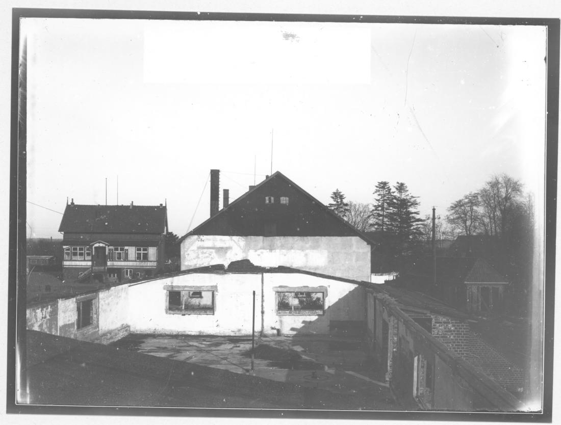 Blick auf das verfallene Unterkunftsgebäude. Im Hintergrund links ist das Verwaltungsgebäude des alten Klinkerwerks zu erkennen. Foto: Strafvollzugsamt Hamburg, vermutlich 1948. (ANg)