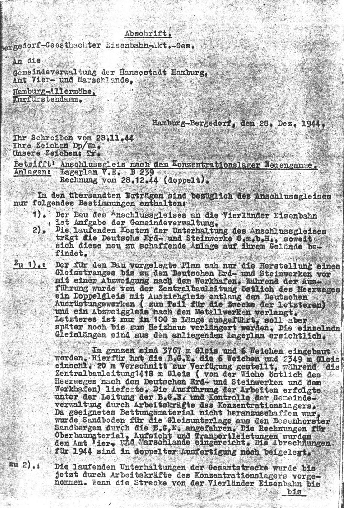Rechnung der Bergedorf-Geesthachter Eisenbahn AG (BGE) über die Erstellung des Gleisanschlusses an die Bergedorf-Geesthachter Eisenbahn, 28.12.1944. In dem Anschreiben sind mehrere Anmerkungen über unabgesprochene Änderungen durch die Zentralbauleitung der Waffen-SS und Polizei Hamburg-Neuengamme enthalten. (ANg)