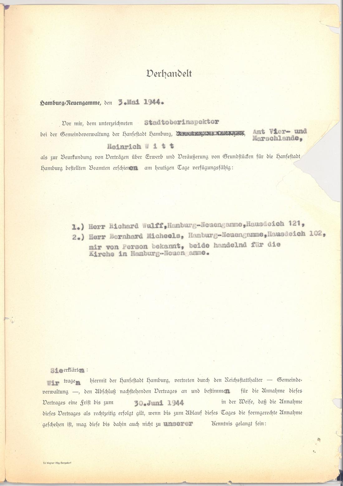 Verhandlungsprotokoll über den Verkauf privater Grundstücke an die Hansestadt Hamburg zur Herstellung des Gleisanschlusses an die Bergedorf-Geesthachter Eisenbahn AG (BGE), 3.5.1944. (ANg)