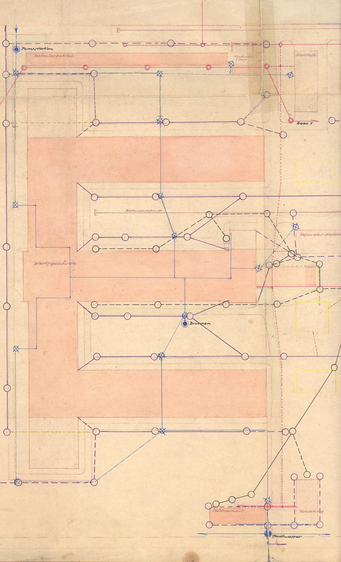 Lageplan des neuen Klinkerwerks. Eingetragen sind die Frisch , Brauch- und Regenwasserkanalisation sowie die Elektroinstallation. Zeitgenössische Bestandszeichnung des ehemaligen Häftlings des KZ Neuengamme Hans-Alf Dortmann, der als Architekt im Baubüro der Deutschen Erd- und Steinwerke GmbH (DESt) tätig war, nicht datiert. (ANg)