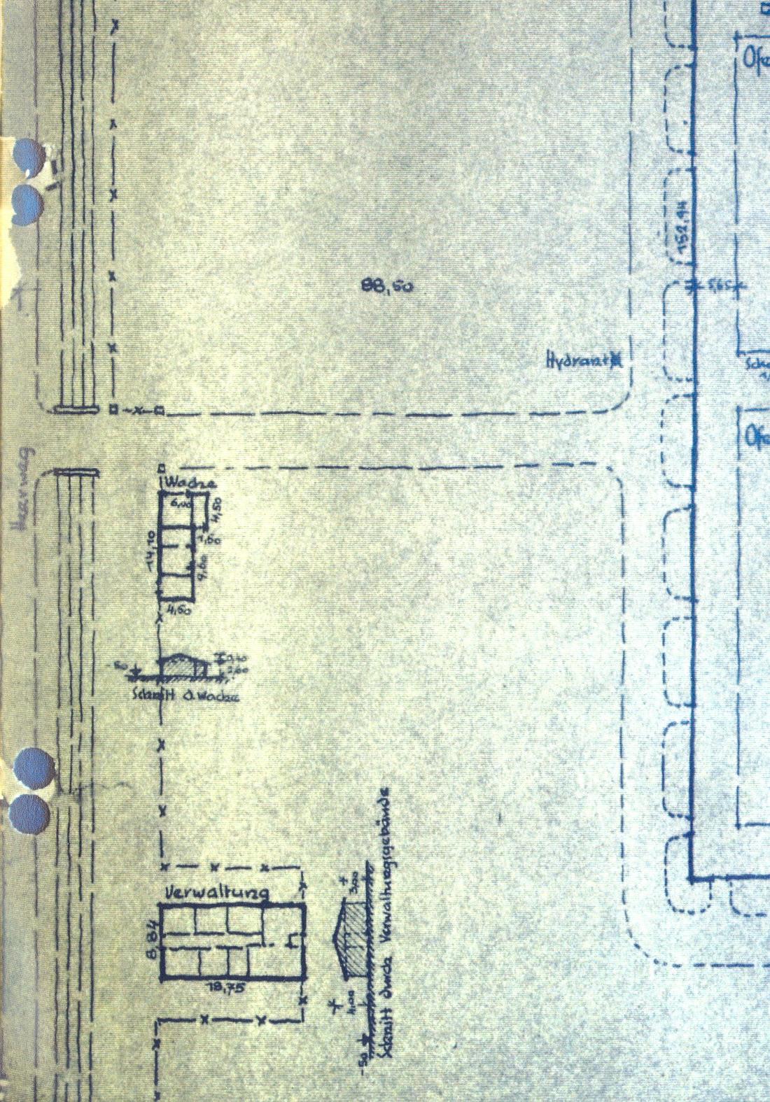 Auszug aus der Abrechnungszeichnung der Deutschen Erd- und Steinwerke GmbH (DESt). Erkennbar ist am linken unteren Rand des Planes die Verwaltungsbaracke der DESt und links in der Planmitte die SS-Wachbaracke. Plan: Deutsche Erd- und Steinwerke GmbH (DESt), 28. April 1942 oder 28. September 1942. (ANg)