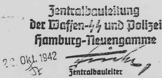 Stempel der Zentralbauleitung der Waffen-SS und Polizei Hamburg-Neuengamme, 22.10.1942. Unterzeichnet hat der Zentralbauleiter, der Architekt Karl Fricke.