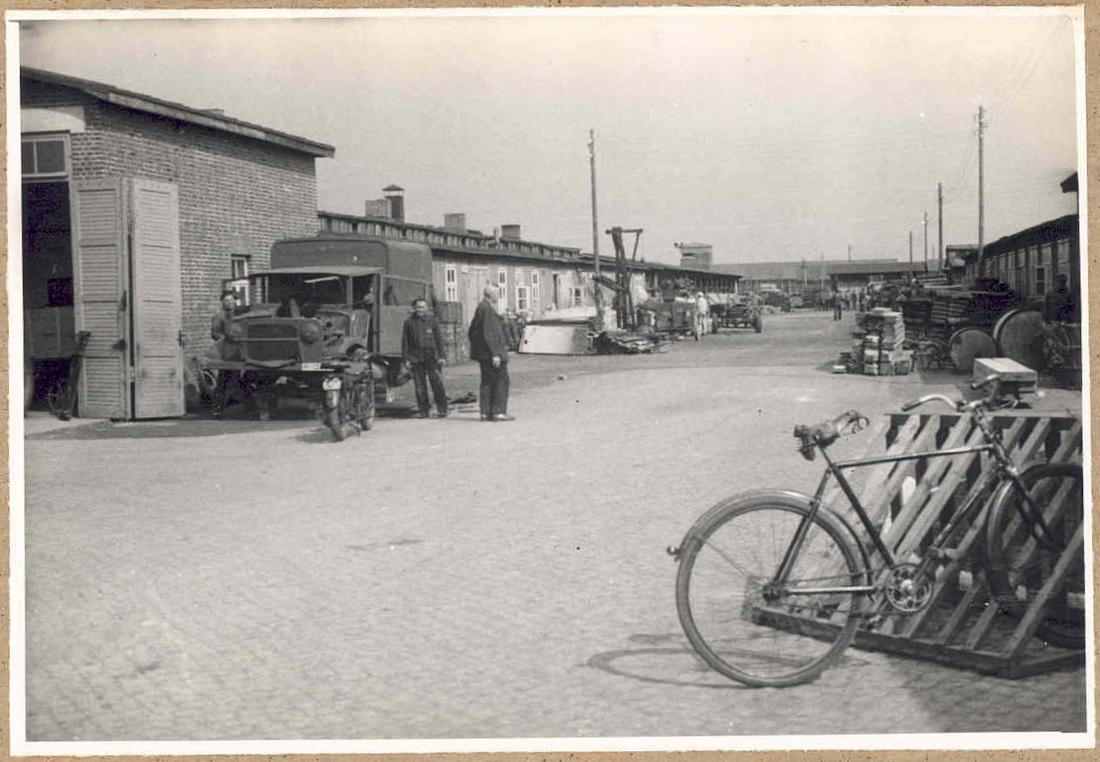 Blick in den Industriehof. Links die Magazin- und Lagerbaracke mit zwei Garagen im massiven Kopfgebäude und rechts die Werkstattbaracke 1 mit der Schmiede. SS-Foto, nicht datiert. (ANg)