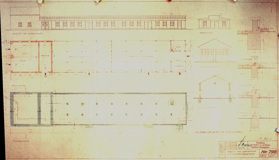 Entwurf Nr. 798 einer Magazin- und Lagerbaracke mit Garagen. Plan: Bauleitung der Waffen-SS und Polizei Hamburg-Neuengamme, 6.3.1942. (CChIDK)