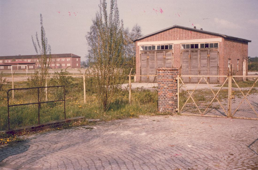 Der massive Garagenanbau der Magazin- und Lagerbaracke blieb noch bis in die 1960er-Jahre ungenutzt stehen. Im Hintergrund ist das östliche Klinkergebäude und davor das 1949/50 gebaute neue Gefängnisgebäude zu erkennen. Foto: unbekannt, 1960. (Privatbesitz Renée Aubry)