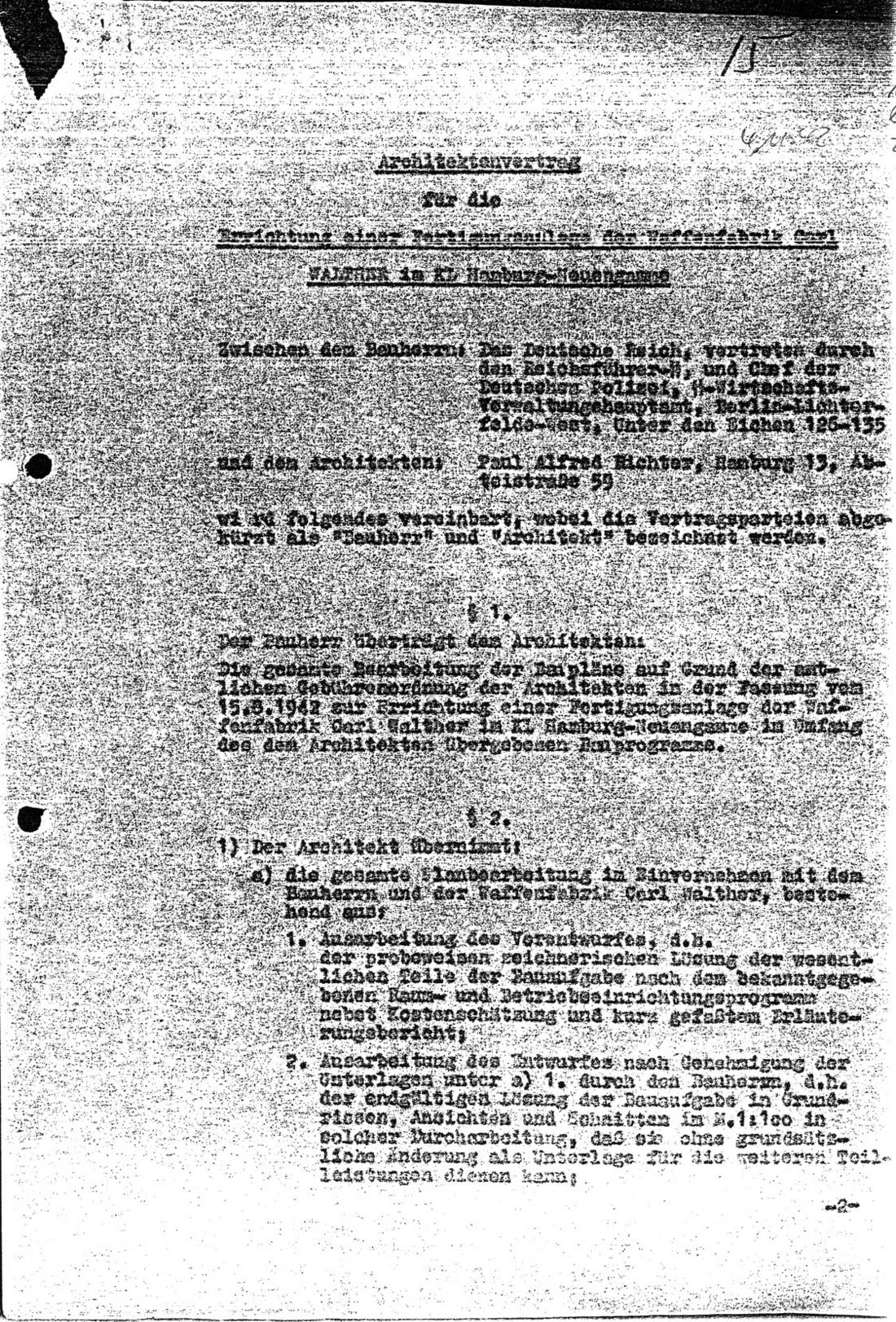 Architektenvertrag zwischen der Reichsführung-SS und dem Hamburger Architekten Paul Alfred Richter über die Planung der „Metallwerke Neuengamme“ der Waffenfabrik Carl Walther GmbH im KZ Neuengamme, 4.11.1942/12.11.1942 (CChIDK)