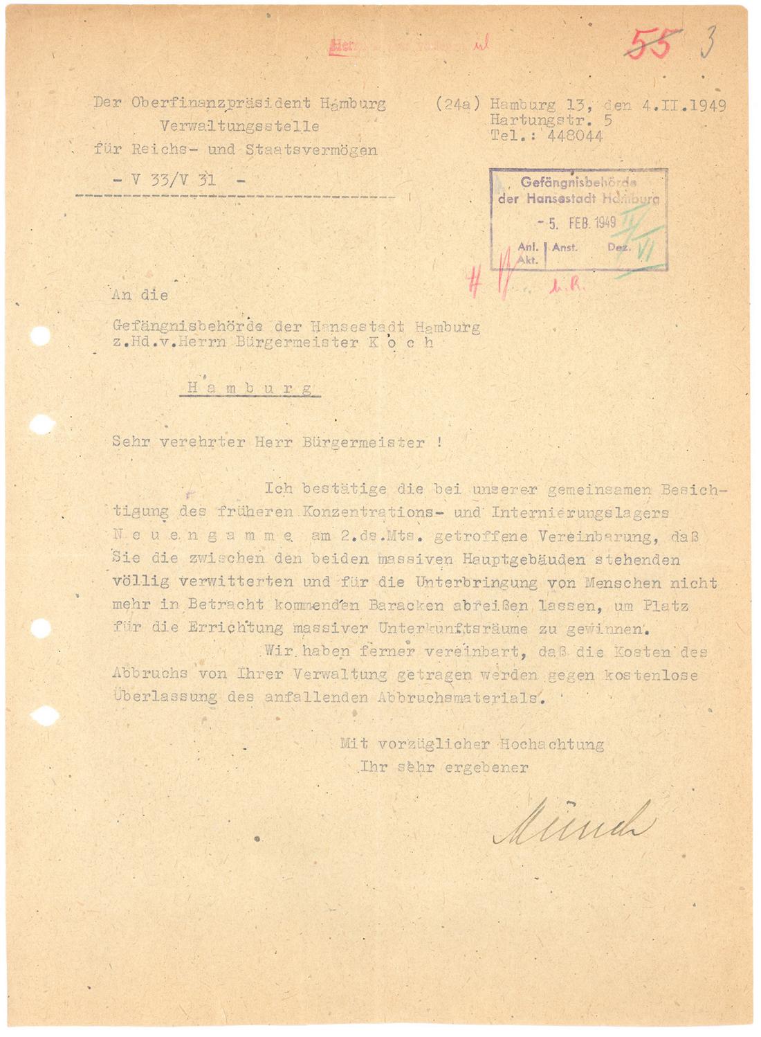 Bestätigung des Leiters des Männergefängnis Neuengamme, Fritz Schütt, über die bei einem Ortstermin mit Hamburgs Erstem Bürgermeister Koch getroffene Entscheidung, die Holzbaracken abzureisen, 4.2.1949. (JbH)