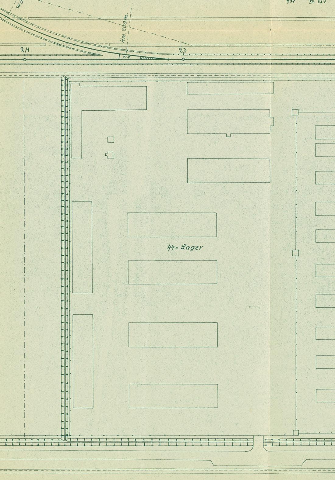 Planauszug des SS-Lagers aus der Planungsgrundlage für einen Gleisanschluss durch die Bergedorf-Geesthachter Eisenbahn AG (BGE). Plan: BGE, April 1941. (ANg)