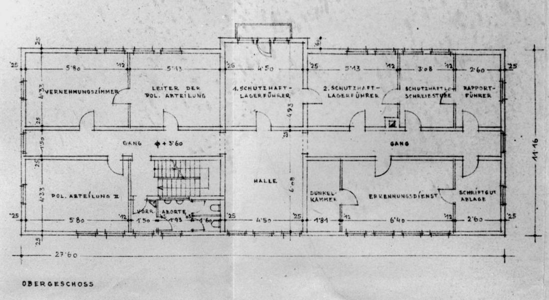 Entwurf eines Torhauses für das „Schutzhaftlager“ (Häftlingslager) Neuengamme. Grundriss des Obergeschosses. Plan: Amtsgruppe C im SS-Wirtschafts-Verwaltungshauptamt, 24.3.1942. (CChIDK)