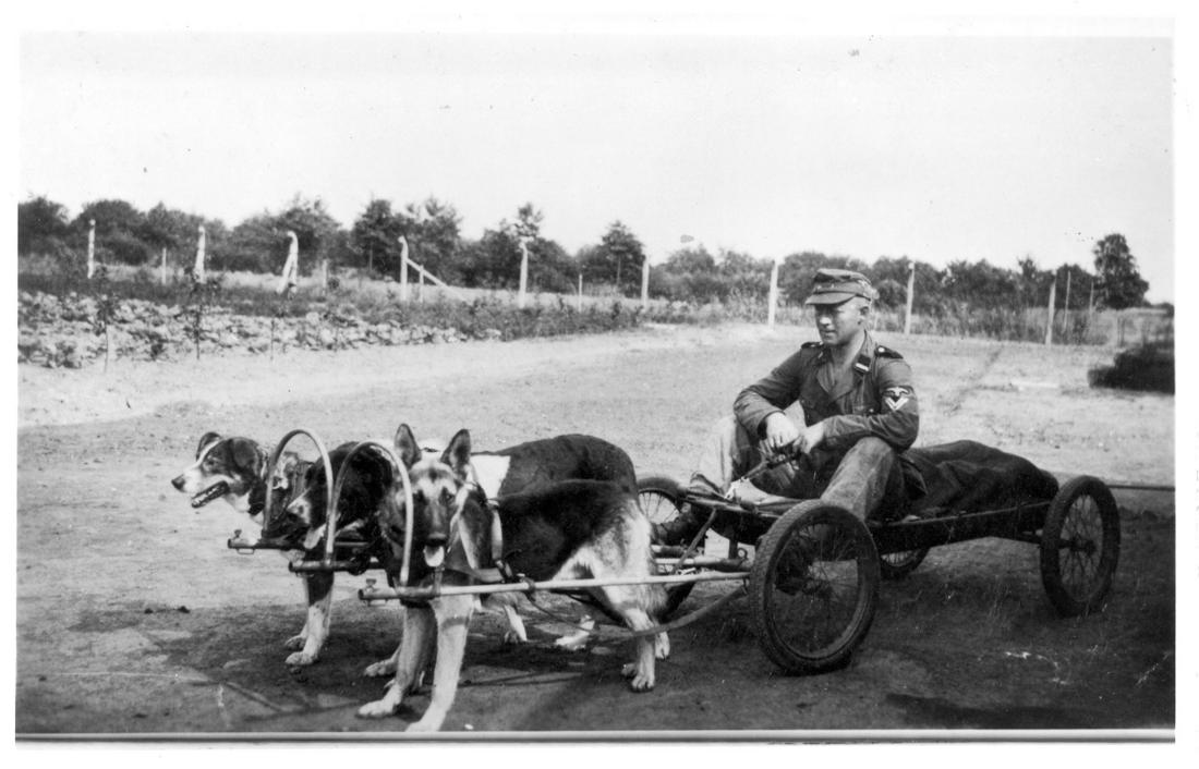 Ein SS-Mann mit Hunden aus der Hundestaffel, die vor einen kleinen Wagen gespannt sind. SS-Foto, nicht datiert. (TNA (PRO))