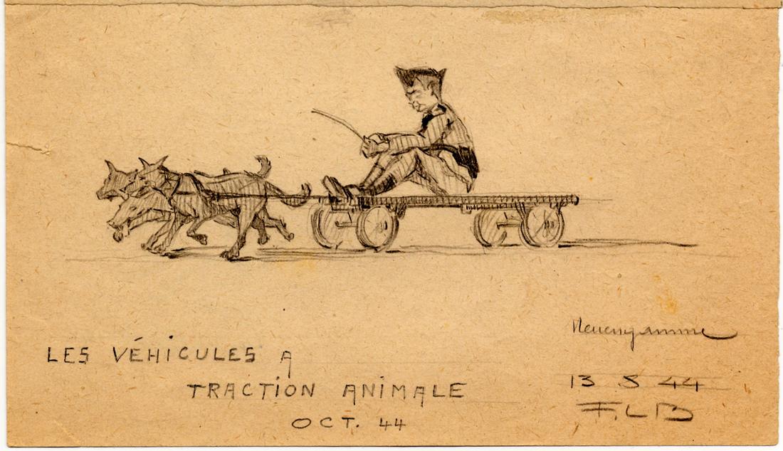 Ein SS-Mann mit Hunden aus der Hundestaffel, die vor einen kleinen Wagen gespannt sind. Bleistiftzeichnung des ehemaligen Häftlings des KZ Neuengamme Lazare Bertrand, 13.8.1944. (MOL)