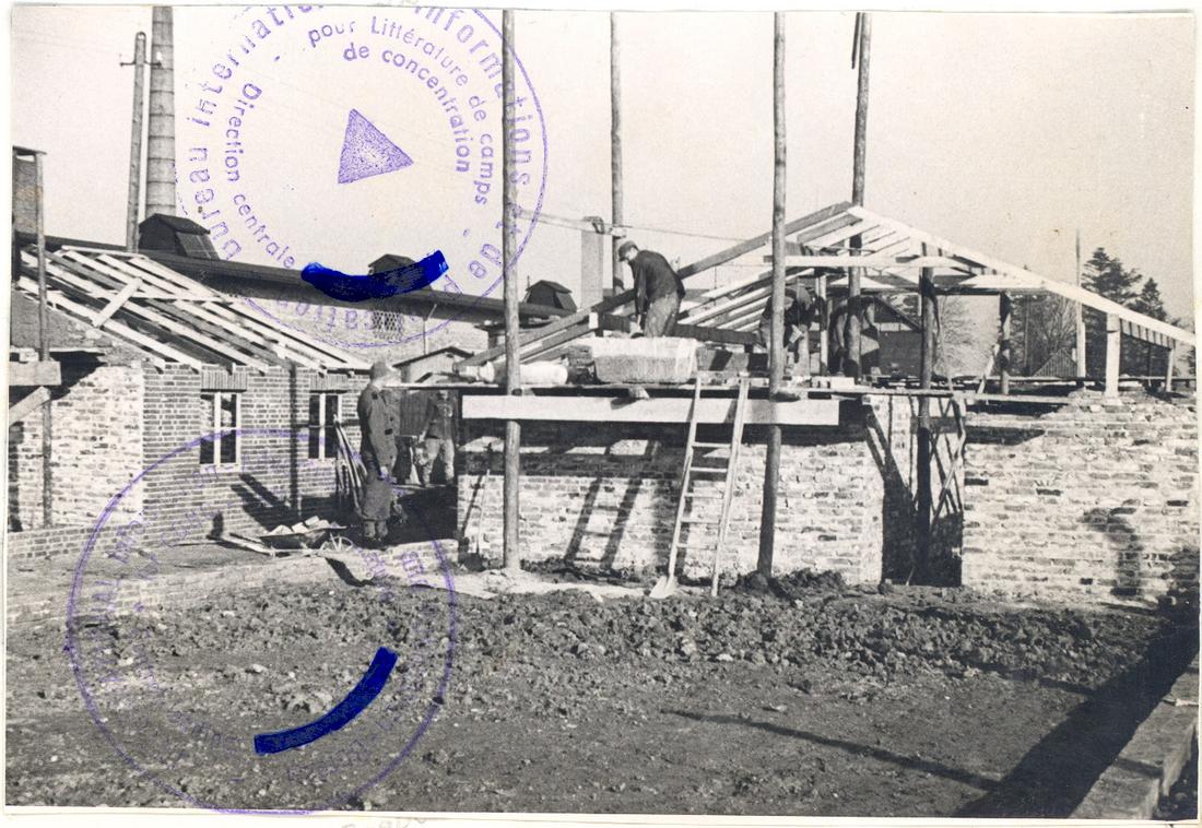 Zimmererarbeiten an den massiven Kopfgebäuden der Gewächshäuser. KZ-Häftlinge erstellen die Dachstühle. SS-Foto aus dem so genannten Masset-Album, nicht datiert. (ANg)