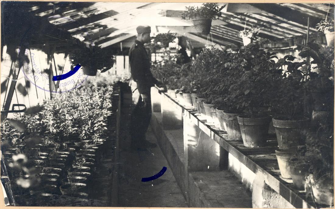 Blick in eines der Gewächshäuser. In der Mitte ist ein hoher Arbeits- und Pflanztisch zu erkennen. SS-Foto aus dem so genannten Masset-Album, nicht datiert. (ANg)