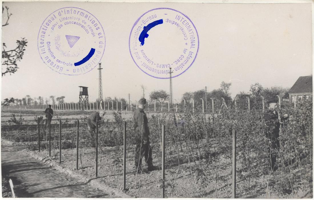 KZ-Häftlinge bei der Arbeit in der Gärtnerei. Im Hintergrund ist ein hölzerner, an einen Hochsitz erinnernder Wachturm und rechts am Bildrand vermutlich eine Landarbeiterkate des „Kellinghusen-Hofes“ zu erkennen. SS-Foto aus dem so genannten Masset-Album, nicht datiert. (ANg)