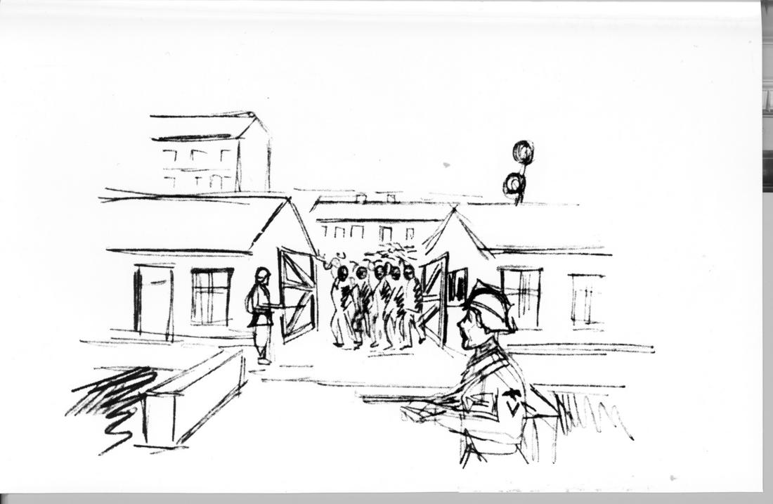 Eingang des „Schutzhaftlagers“ (Häftlingslager). Zeichnung des ehemaligen Häftlings des KZ Neuengamme Per Ulrich, nicht datiert. (ANg)