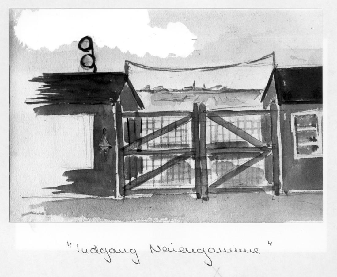 Eingang des „Schutzhaftlagers“ (Häftlingslager) von innen. Zeichnung des ehemaligen Häftlings des KZ Neuengamme Per Ulrich, nicht datiert. (ANg)