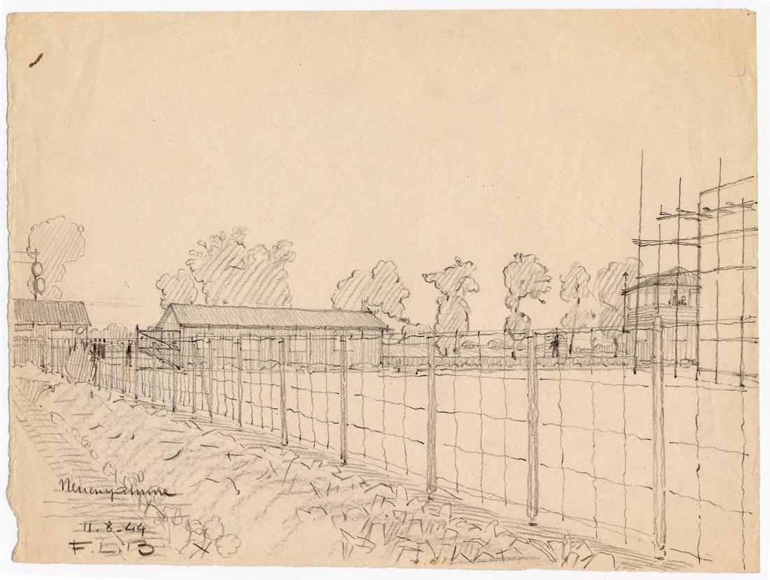 Eingang des „Schutzhaftlagers“ (Häftlingslager) von innen. Bleistiftzeichnung des ehemaligen Häftlings des KZ Neuengamme Lazare Bertrand, 11.8.1944. (MOL)