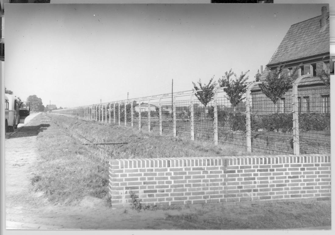 Der Lagerzaun im Bereich des Verwaltungsgebäudes der Deutschen Erd- und Steinwerke GmbH. Foto: unbekannt, nicht datiert (Nachkriegsaufnahme). (Privatbesitz Renée Aubry)