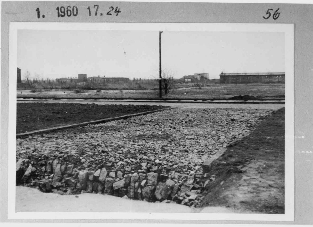 Blick in südlicher Richtung über den beseitigten und mit Mutterboden aufgeschütteten Appellplatz. Im Hintergrund standen die Funktionsbaracken des „Schutzhaftlagers“ (Häftlingslager). Foto: Strafvollzugsamt Hamburg, nicht datiert (Nachkriegsaufnahme). (ANg)
