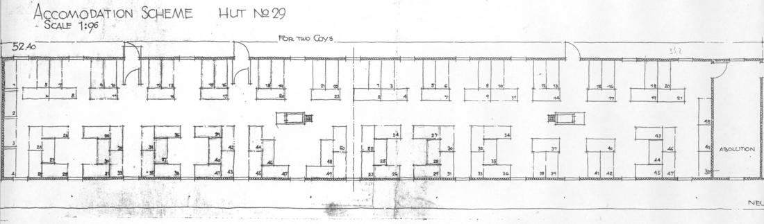 Lageplan der Häftlingsbaracke 5 (die unmittelbar angrenzende Baracke 6 war vom Grundriss her gespiegelt). Die hintereinanderstehenden und durch eine gemeinsame Latrine verbundenen Baracken hatten in der britischen Gebäudenummerierung die gemeinsame Nummer 29. Plan: Deputy Commander Royal Engineers, Work Section 218, nicht datiert. (ANg)
