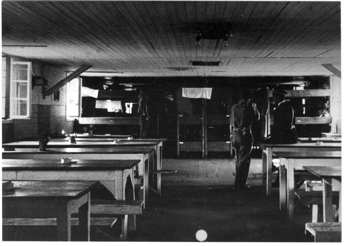 Blick in den Aufenthaltsbereich einer Unterkunftsbaracke mit Holztischen und bänken. Im Hintergrund die separaten Betten der Funktionshäftlinge. Foto: unbekannt, nicht datiert (Nachkriegsaufnahme). (ANg)