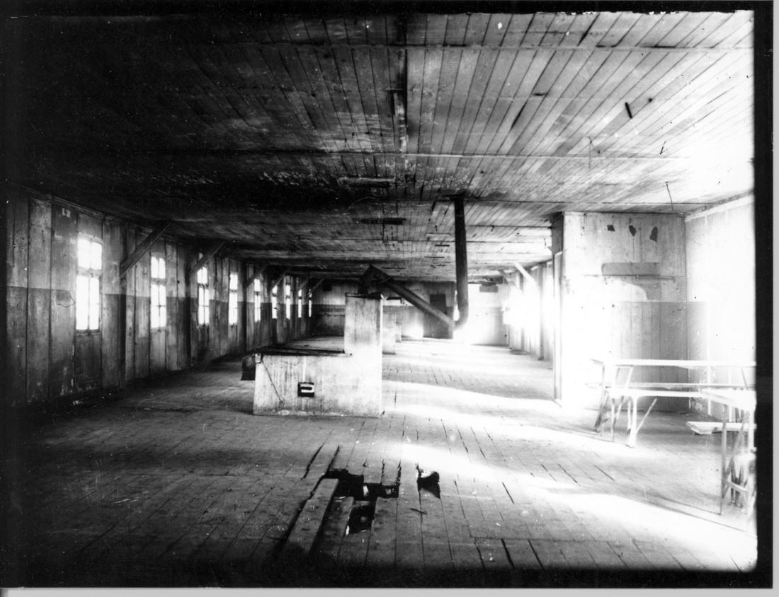Blick in eine geräumte Unterkunftsbaracke. In der Mitte ist der kleine Ofen zu erkennen. Foto: Strafvollzugsamt Hamburg, nicht datiert (Nachkriegsaufnahme). (ANg)