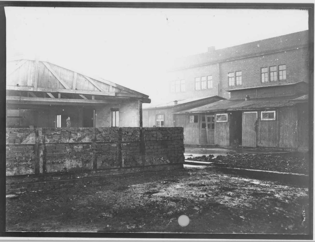 Abriss der ehemaligen Unterkunftsbaracken. Zu erkennen ist im Hintergrund eines der Klinkergebäude und davor der überbaute Latrinenbereich. Foto: Strafvollzugsamt Hamburg, vermutlich 1949. (ANg)