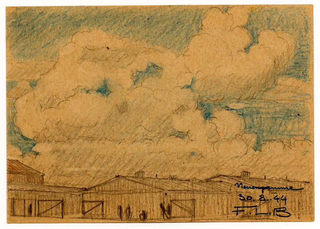 Ansicht der Unterkunftsbaracken aus Richtung des Appellplatzes. Zeichnung des ehemaligen Häftlings des KZ Neuengamme Lazare Bertrand, 30.8.1944. (MOL)