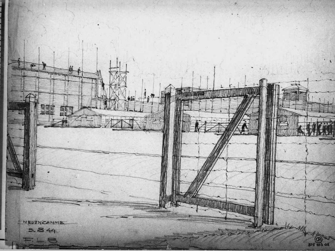 Häftlinge beim Bau des westlichen Klinkergebäudes. Blick aus Richtung der Krankenreviere. Im Vordergrund sind der Appellplatz und drei der Unterkunftsbaracken zu erkennen. Bleistiftzeichnung des ehemaligen Häftlings des KZ Neuengamme Lazare Bertrand, 5.8.1944. (ANg)