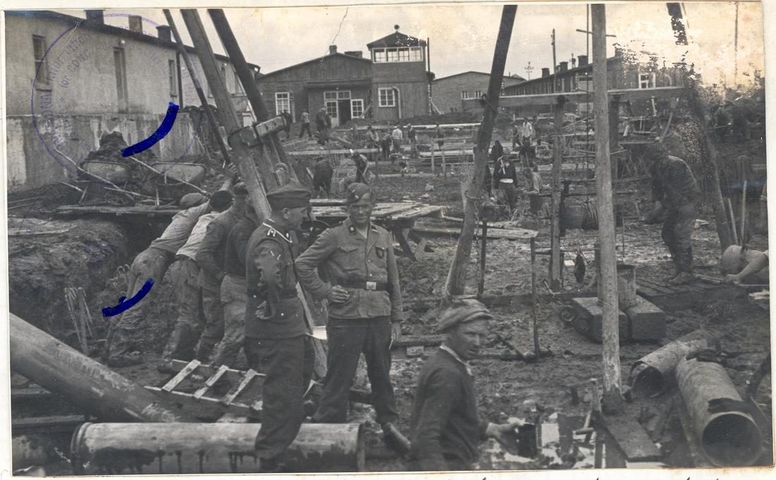 Ausschachtungsarbeiten für das östliche Klinkergebäude. Blick von Süden. Links sind die Häftlingskantine und im Hintergrund die SS-Küche, die SS-Kantine und die SS-Garagen zu erkennen. SS-Foto aus dem so genannten Masset-Album, nicht datiert. (ANg)