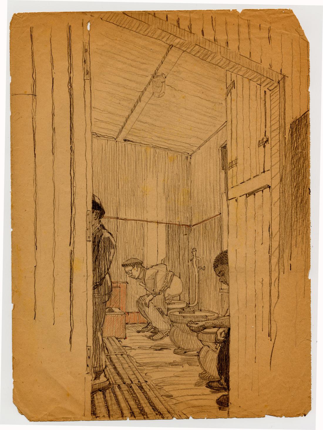 Blick in eine der Latrinen im Sonderlager für französische Prominente. Bleistiftzeichnung des ehemaligen Häftlings des KZ Neuengamme Lazare Bertrand, nicht datiert. (MOL)