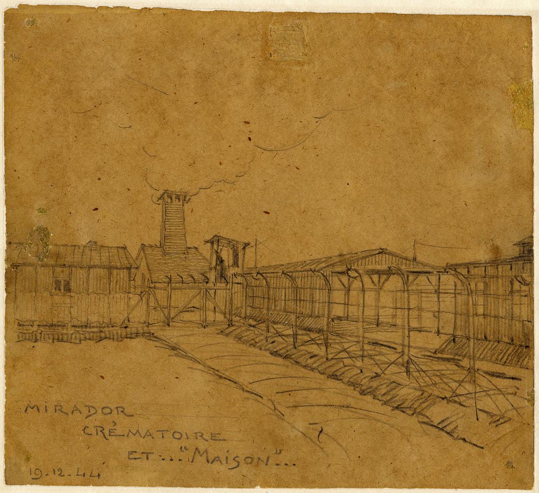Krematoriumsansicht. Links am Rand ist das Häftlingsbordell (von dem Zeichner als „Maison“ bezeichnet) zu erkennen. Bleistiftzeichnung des ehemaligen Häftlings des KZ Neuengamme Lazare Bertrand, 19.12.1944. (MOL)
