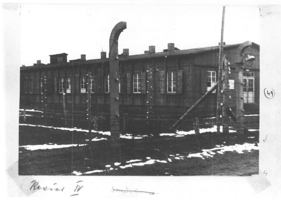 Ansicht des Häftlingsbordells durch den Stacheldrahtzaun. Foto: unbekannt, nicht datiert (Nachkriegsaufnahme). (ANg)