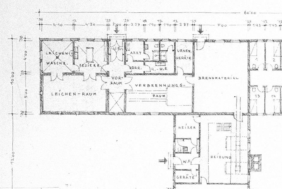 Detailvergrößerung des geplanten Krematoriums. Die waren entsprechend dem Ablauf der Einäscherung angelegt. Plan: Amtsgruppe C im SS-Wirtschafts-Verwaltungshauptamt, 25.2.1942. (CChIDK)