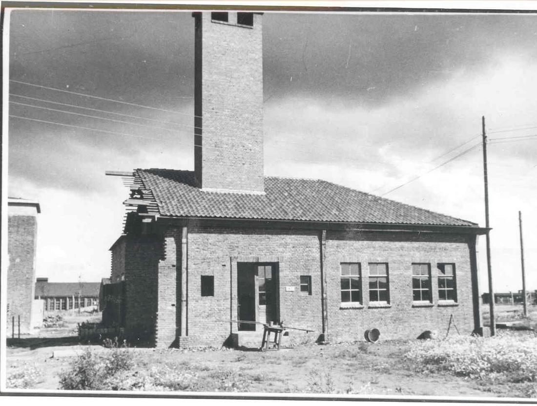 Westliche Ansicht des Krematoriums. Links ist das nicht fertig gestellte Gebäude zu erkennen. Foto: unbekannt, nicht datiert (Nachkriegsaufnahme). (ANg)