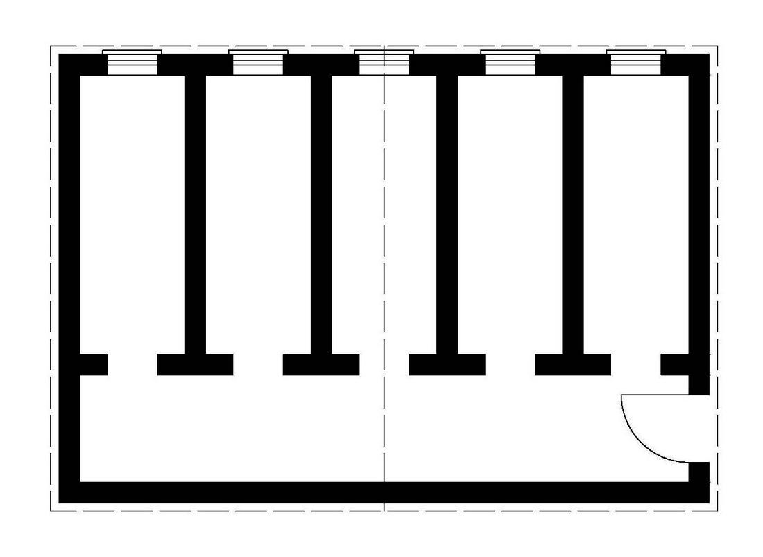 Rekonstruktion des Grundrisses des Arrestbunkers (Lagergefängnis). Fünf 1,25 m × 3,10 m große Zellen lagen an einem 1,30 m breiten Flur. Plan: Andreas Ehresmann, 2004. (Privatbesitz Andreas Ehresmann)