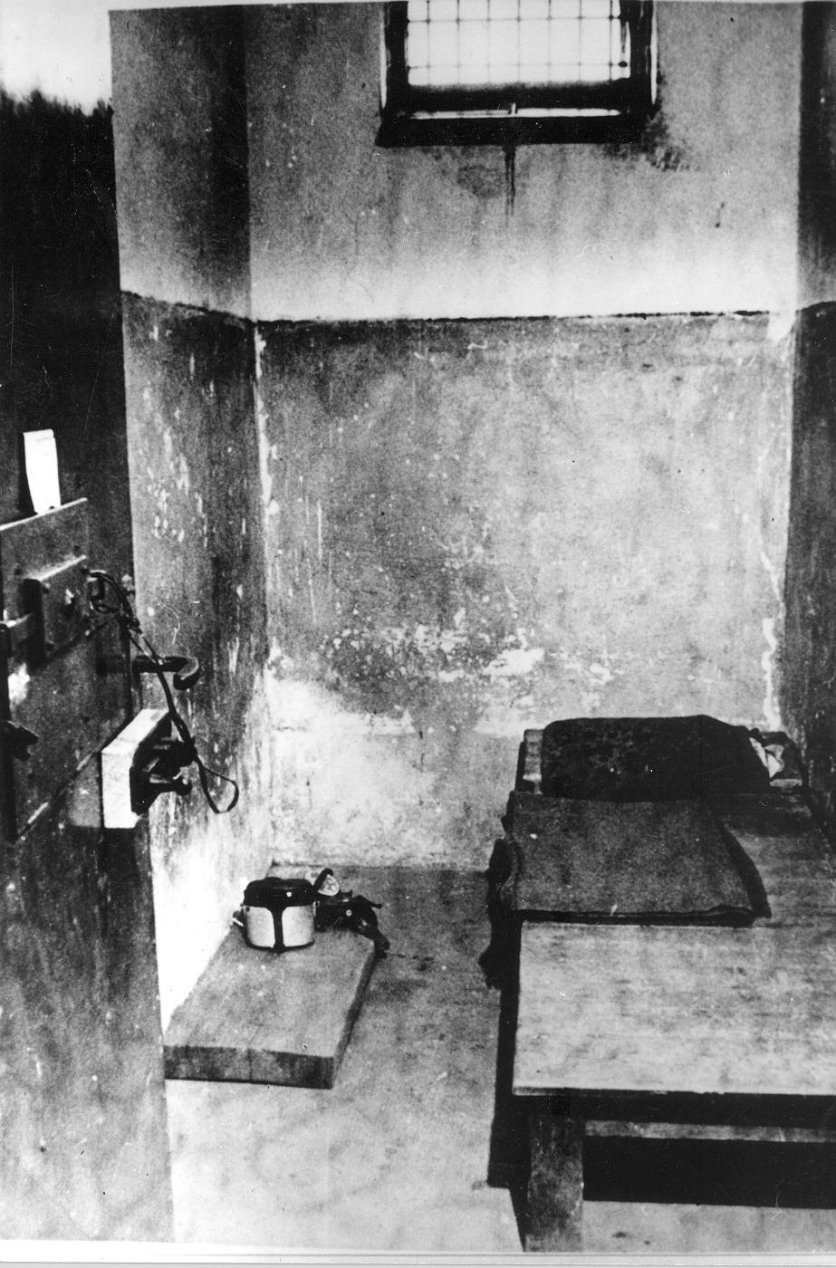 Blick in eine der Zellen des Arrestbunkers (Lagergefängnis). Es ist nicht bekannt, ob die Pritsche und das als Tisch genutzte Brett die ursprüngliche Einrichtung waren oder dem britischen Standard entsprachen. Foto: unbekannt, nicht datiert (Nachkriegsaufnahme). (ANg)