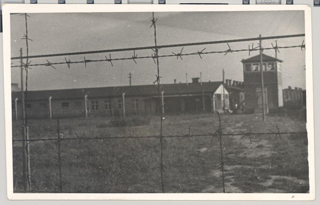 Blick durch den Stacheldraht auf die Baracke mit der Entlausungsanlage. Foto: Zdzisław Sokół, nicht datiert (Nachkriegsaufnahme). (ANg)