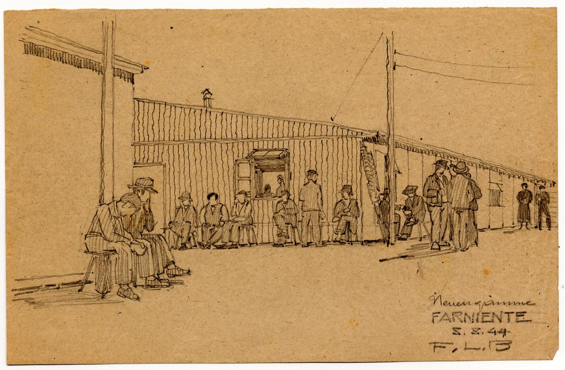 Westliche Giebelansicht eines Krankenreviers (vermutlich Krankenrevier III). Von Juli bis Oktober 1944 wurden die Krankenreviere III und IV geräumt und bis zur Fertigstellung eines Sonderlagers mit französischen Häftlingen belegt. Bleistiftzeichnung des ehemaligen Häftlings des KZ Neuengamme Lazare Bertrand, 8.8.1944. (MOL)