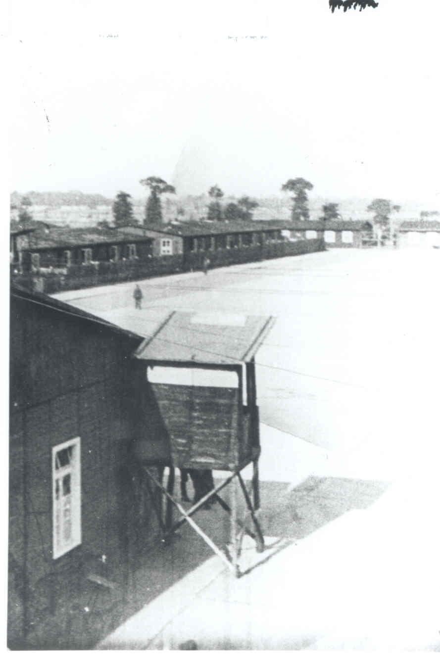Blick von der Häftlingsküche über den Appellplatz in Richtung des Eingangs des „Schutzhaftlagers“ (Häftlingslager). Links sind die Krankenreviere III und IV zu erkennen. Im Hintergrund schließen die beiden Bürobaracken am Lagereingang an. Foto: unbekannt, nicht datiert (Nachkriegsaufnahme). (ANg)