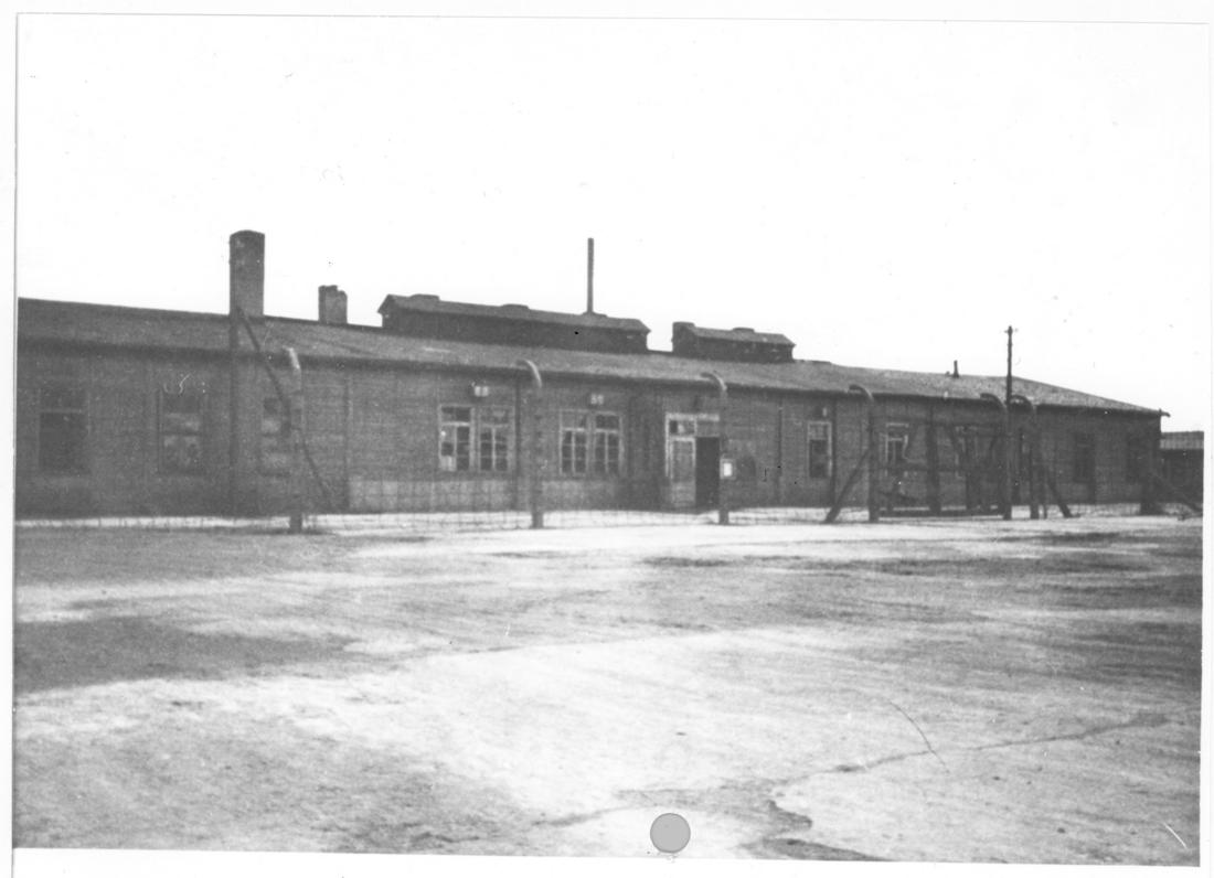 Ansicht der Häftlingsküche. Im britischen Internierungslager CIC 6 wurde offensichtlich ein neuer Zaun aus KZ Zaunpfählen vor der Küche errichtet. Foto: unbekannt, nicht datiert (Nachkriegsaufnahme). (ANg)