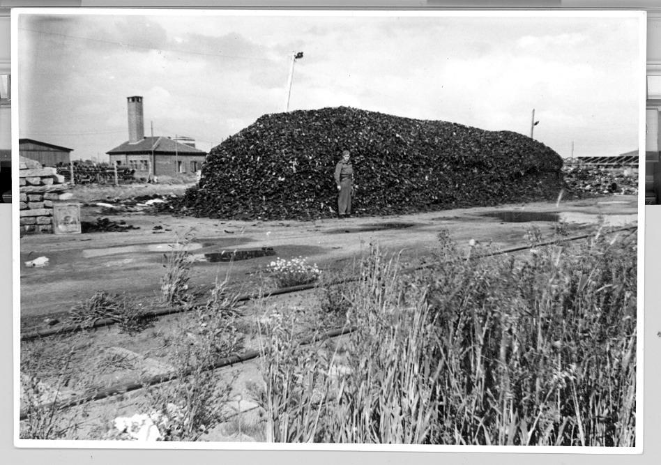 Ein britischer Soldat vor dem Schuhberg. Links hinter dem Schuhberg ist das Krematorium zu erkennen. Foto: unbekannt, nicht datiert (Nachkriegsaufnahme). (ANg)