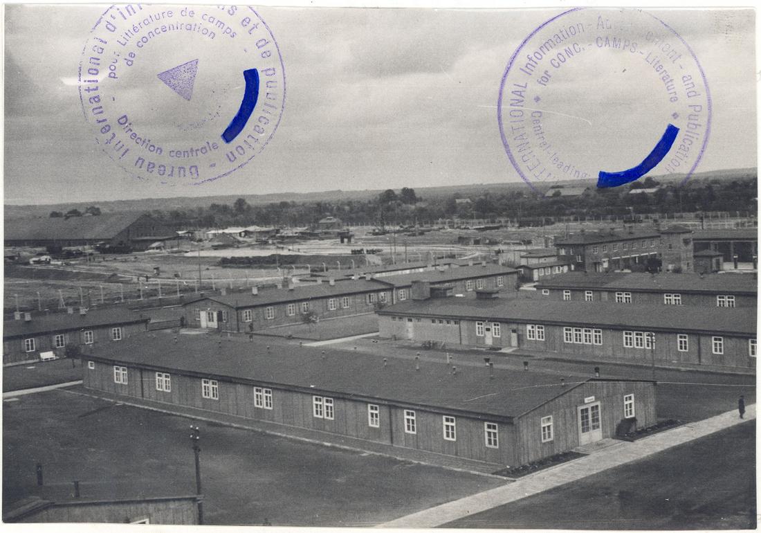 Blick über das SS-Lager. Im Vordergrund sind Unterkunftsbaracken und das Krankenrevier zu erkennen. Rechts dahinter befindet sich der SS-Garagenhof. Im Hintergrund ist das neue Klinkerwerk zu sehen. SS-Foto aus dem so genannten Masset-Album, nicht datiert. (ANg)