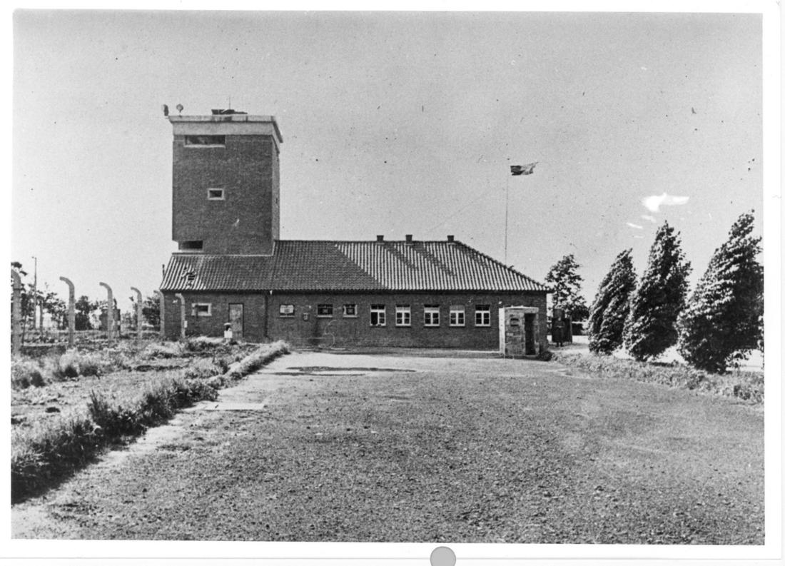 Die ehemalige SS-Hauptwache vom Lager her gesehen. An der linken Gebäudeseite ist der nordwestliche steinerne Wachturm aufwendig an das Gebäude angebaut worden. An der rechten Wachgebäudeseite ist ein so genannter Einmannbunker, der einem SS-Wachmann Schutz bieten sollte, zu erkennen. Foto: unbekannt, nicht datiert (Nachkriegsaufnahme). (ANg)