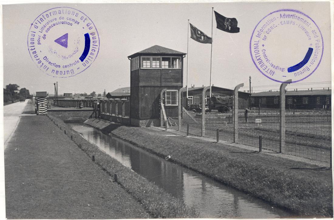 Ansicht des SS-Lager-Eingangs von Süden. Rechts bei den Fahnenmasten ist die Kommandantur und daran anschließend eine SS-Unterkunftsbaracke zu erkennen. SS-Foto aus dem so genannten Masset-Album, nicht datiert. (ANg)