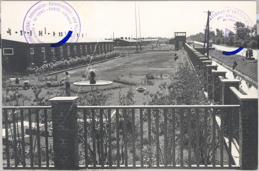 Westliche Ansicht der SS-Kommandantur. Rechts von der Kommandantur ist die gestaltete Grünfläche zu erkennen. Im Hintergrund schließt das „Schutzhaftlager“ (Häftlingslager) an. SS-Foto aus dem so genannten Masset-Album, nicht datiert. (ANg)